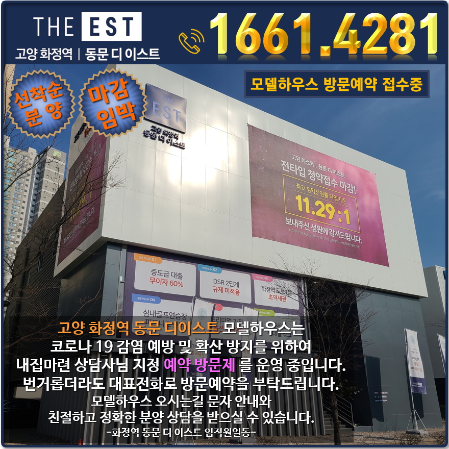 회사보유분 잔여세대를 선착순 분양 중인 고양 화정역 동문 디이스트 모델하우스는 코로나 19 방역 지침에 따라 방문예약제를 운영 중입니다. 모델하우스 대표전화로 문의 하시면 홍보관 오시는 길 문자 안내 및 방문예약증을 문자로 받으실 수 있으며 내집마련 전문 상담사님을 통해 친절하고 자세한 분양 안내를 받으실 수 있습니다.
