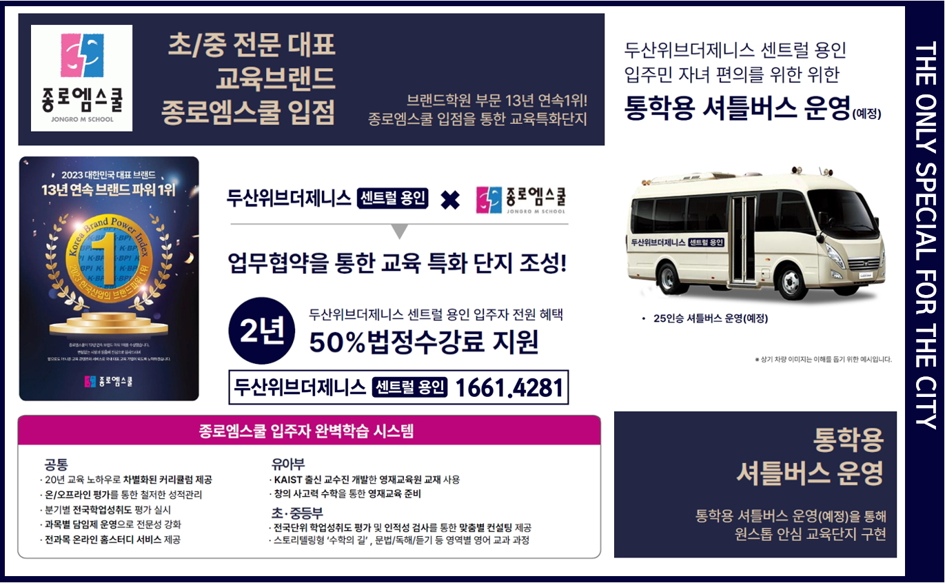 ▶종로엠스쿨 입점 업무협약으로 입주자 전원 2년간 법정 수강료 50% 지원 / 통학용 셔틀버스