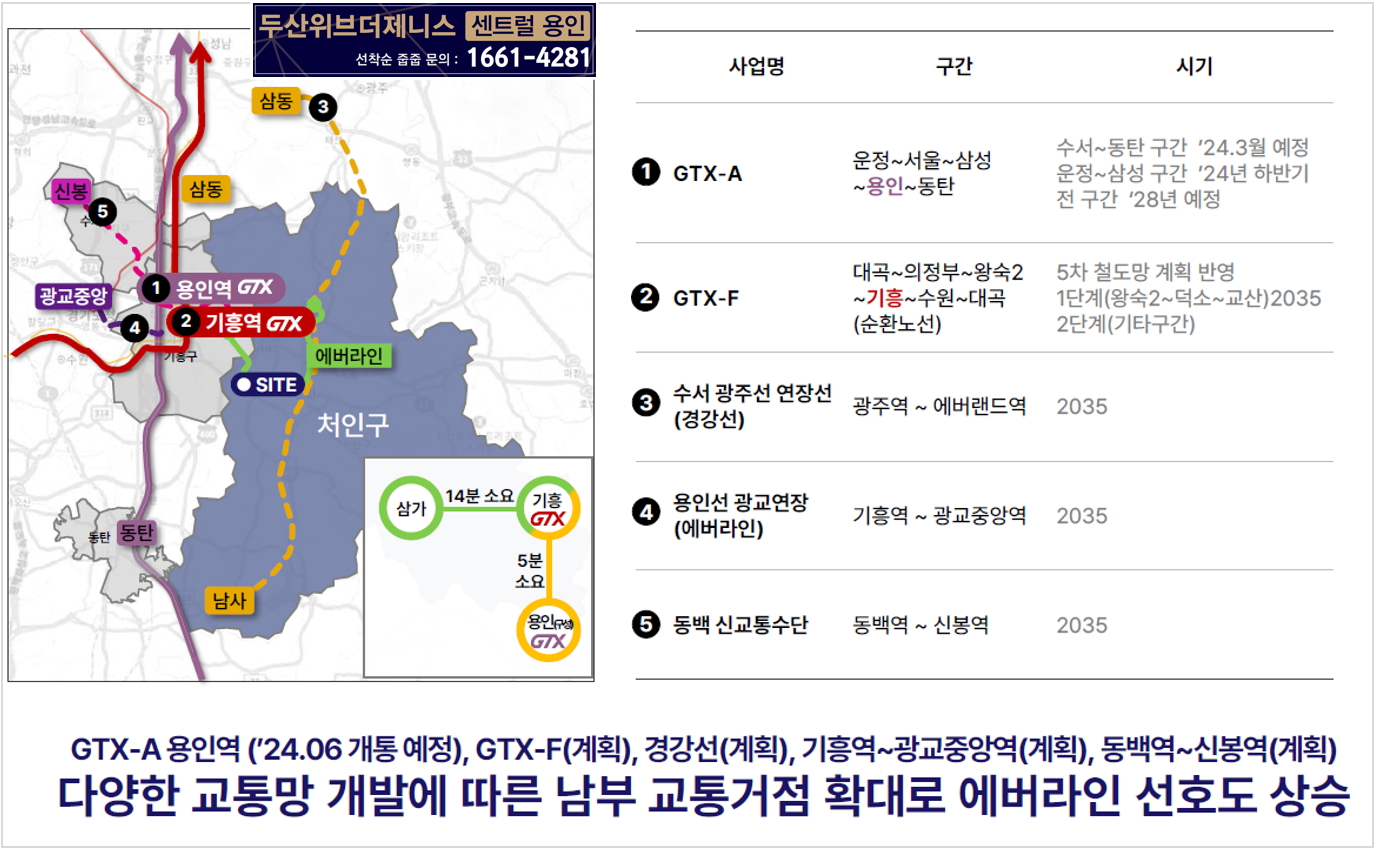 두산위브더제니스 센트럴 용인 아파트 단지는 GTX-A노선 구성역(예정)과 F노선 기흥역(예정)이 인근에 위치해 있어 향후 개통 시 편리하게 이용할 수 있을 것으로 보입니다. 특히 지하철 에버라인 삼가역을 도보로 이용할 수 있는 초역세권 단지로 이 노선을 이용해 수인분당선 환승역인 기흥역까지 10분대, 신분당선 양재역까지 1시간 만에 이동할 수 있어 서울 및 인근 지역으로 출퇴근이 편리한 입지입니다.