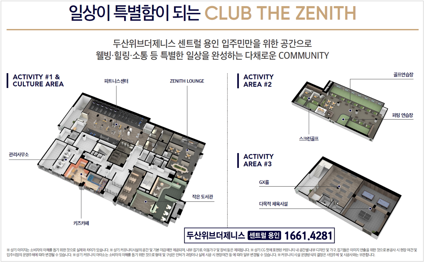 - 피트니스센터, GX룸, 다목적 체육시설, 골프연습장, 스크린골프, 퍼팅연습장, ZENITH 라운지, 작은도서관, 키즈카페, 어린이집, 경로당 등